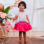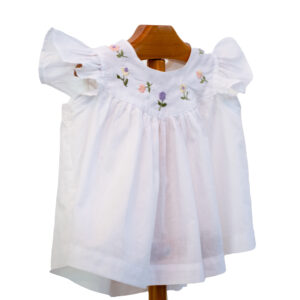 A precious little blouse for your baby girl. An elegant, white flutter blouse delicately hand embroidered with scattered flowers in pastel shades around the yoke. The placement of the scattered flowers is unique to each blouse. The beautiful hand-embroidered buttons that are featured on the blouse are absolutely adorable. Pair the Cleo flutter top with the lovely Brigid smocked ruffle bottom.