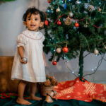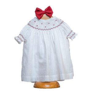 We have the perfect dress for your little munchkin to celebrate her first Christmas. A beautiful white bishop dress smocked in white diamond stitches and embellished with scattered red cable stitches. The edge of the yoke is richly smocked in red and sliver zigzag trellis stitch. The puff sleeves have the same detailed smocking. The outfit includes a diaper cover. The elegant Lumi bishop is timeless and is the perfect dress for Santa’s princess.