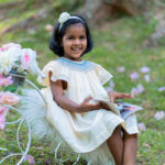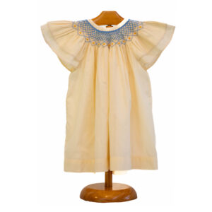 A beautiful bishop dress for your little girl in the softest cotton. The sleeves are flowing and luxurious. The double flutter sleeves have handmade bobbin lace trims making it timeless and elegant. The smocking features a combination of delicate stitches in shades of blue, creating dainty heart motifs. Pretty flowers in cable stitch are embroidered around the yoke. The dress is dreamy and the perfect addition to your little girl’s wardrobe.
